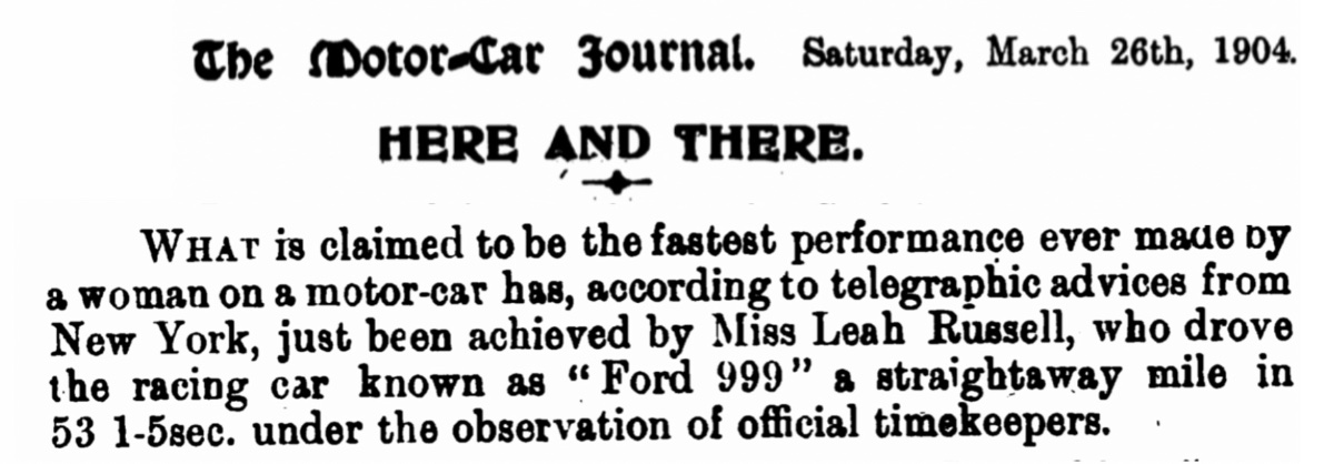 I thought this article regarding women (there will be a second mentioned later) and Henry Ford's famous 999 racer. In this first case, reporter Eleanor Wild (pseudonym?) describes her successful effort to ride Ford's race car. As it turns out, this is very early in the long life of Henry Ford's most famous racer: