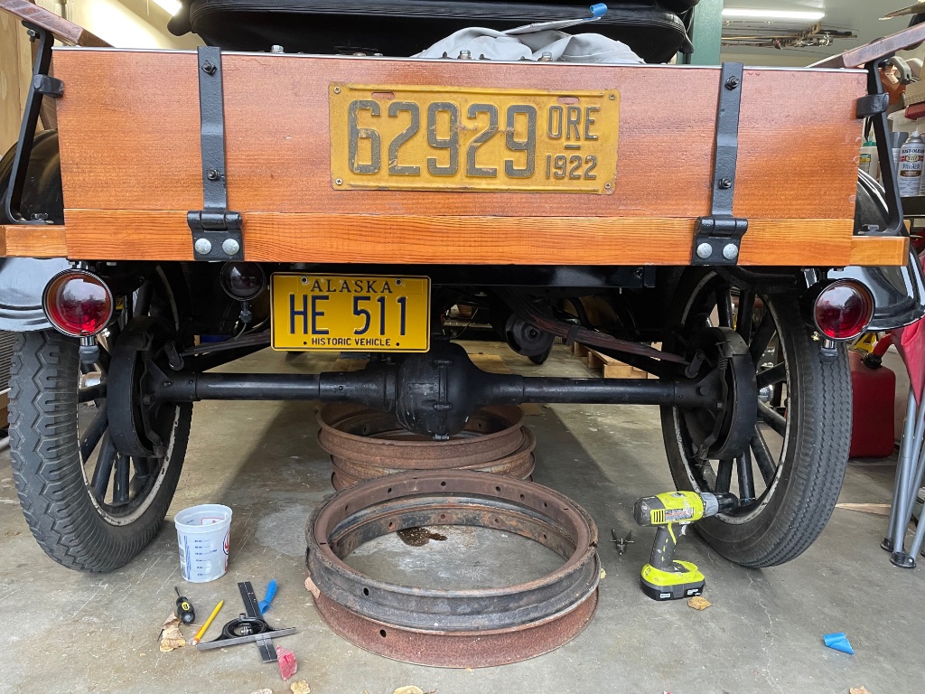 I wanted to put brake and tail lights on my 22 runabout pickup but I wanted them to look period. I bought some of the aftermarket lights then converted them to take the two contact T headlight sockets. I then made up a couple of mounts to screw to the bottom of the bed. I don’t think it looks too bad.