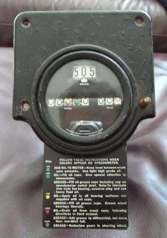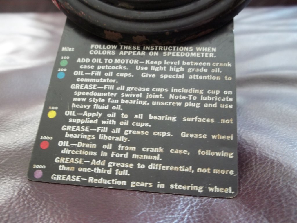 Possibly one of the rarest speedometer items I have run across is the lubrication tag that came with the Stewart Model 160 speedometer kit. The tag provided the owner the information necessary to properly maintain his Ford when a colored odometer dial came into view and was kept out of sight by a spring attached to the speedometer. Unfortunately, as Will found out, the pot metal odometer dials swell, making the speedometer unserviceable, but the booklet that Jim has provided in this thread and the lubrication tag are of great interest when installing a Stewart speedometer. I have only seen two of these tags.