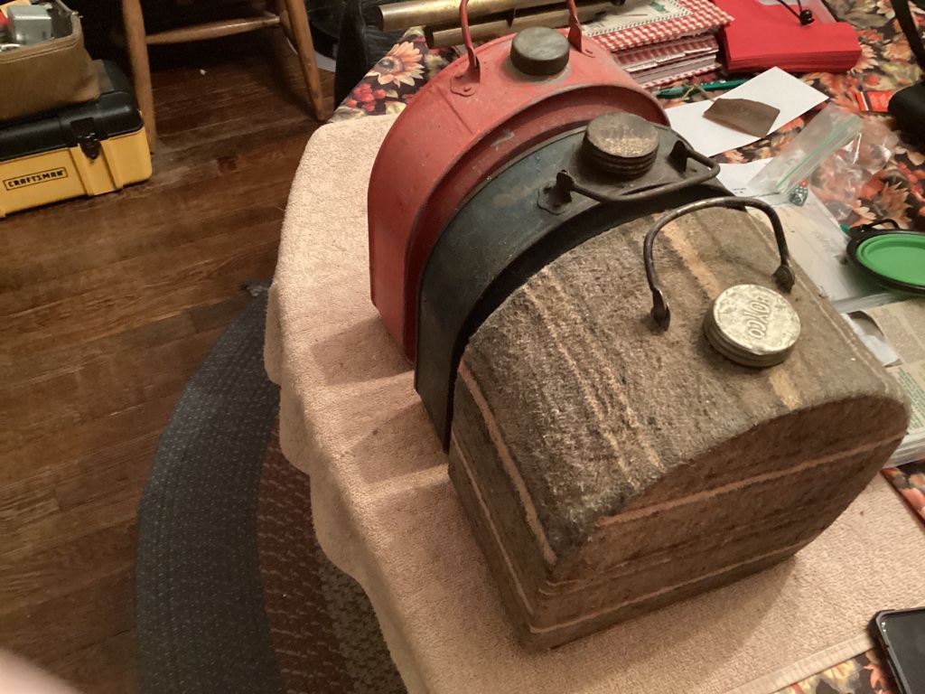 For sale. Are 3 nice cans, the blue oil can and the larger water can both have Boyco caps, the red gas can has a fine thread plain cap. All are in good condition, no holes or dents. $185.00 plus shipping. Email me if interested.