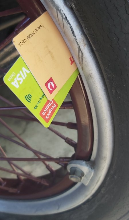 This is a non-Hayes fixed lug rim on a Hayes felloe. Note the lug stands off the outside face of the felloe just as the Hayes lug does. The rim wedges on the inside land of the felloe as it should. The take home message is fixed lug rims fit on the felloe in the same way, but a zHaues rim needs the relief in the felloe for the foot on the lug.