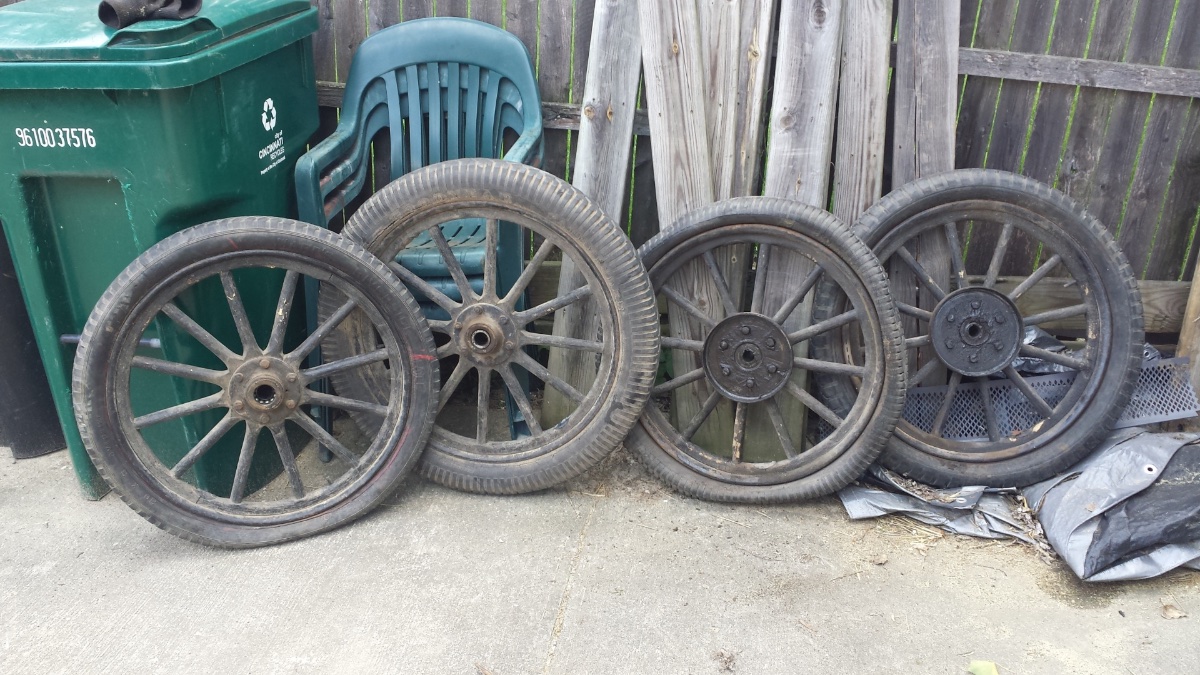 FS 1915 front and wheel wood spoked wheels with 3 inch front and 3.5 inch rear clincher rims, and hubs. Wood spokes are trash, but were previousl usable for a roller project. Sold as the set only, 400.00 plus S/H. 513 three seven eight 4235.
