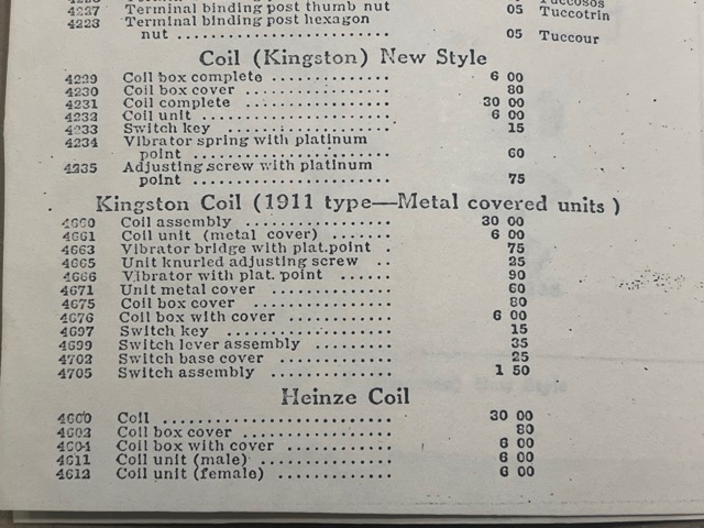 For sale is a 1911 Kingston coil box with the original metal top coils. These metal top coils were only used in 1911 and this is the only one of these units I’ve ever seen. As you can see from the pictures, it’s very complete and in excellent condition. $1200.00 postpaid to lower 48 states. kdmks AT att.net.