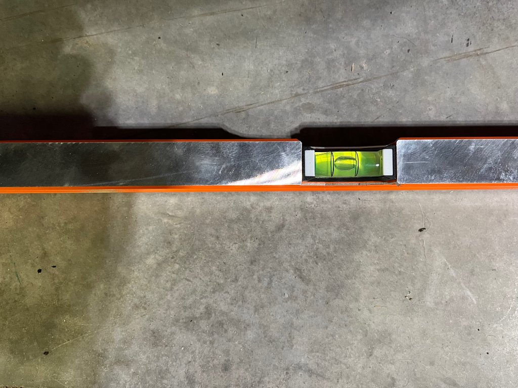 5) I placed a level on the garage floor, perpendicular to the frame, to determine if the rails were level. They are. This procedure will be shown in the next post.