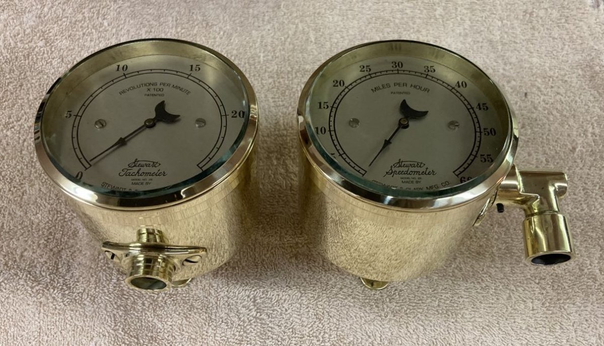 Here are a pair of brass instruments that would be great for a speedster. These are REPRODUCTION electronic instruments made to appear as an original speedometer and tachometer. The speedometer and tachometer both operate electronically. I don't know who made these instruments but they are very well done. They have a heavy brass case with the electronic units inside, silver dial faces, beveled glass lenses and brass mounting brackets. I don't know how to connect them to make them work. $550 plus $18 for shipping for the two instruments.