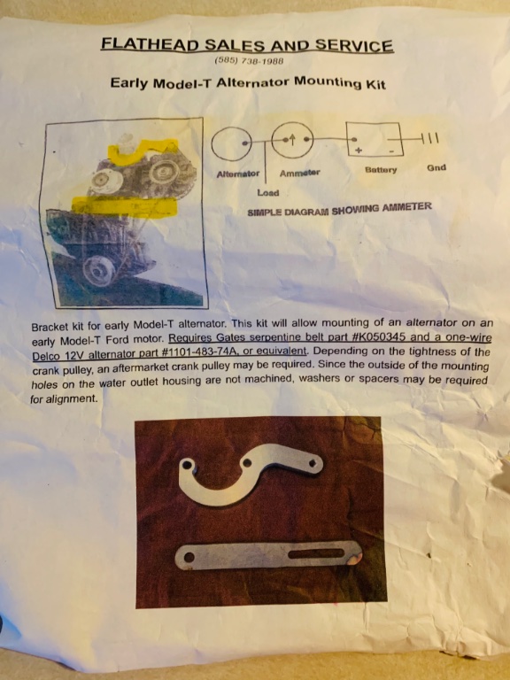 Bracket kit for early Model T Ford. This kit will allow mounting and alternator on pre-1919 Model Ts. Please review the requirements and notes on the attached photo. Serious inquiries only, no solicitations. Contact Tom at 585-738-1988.