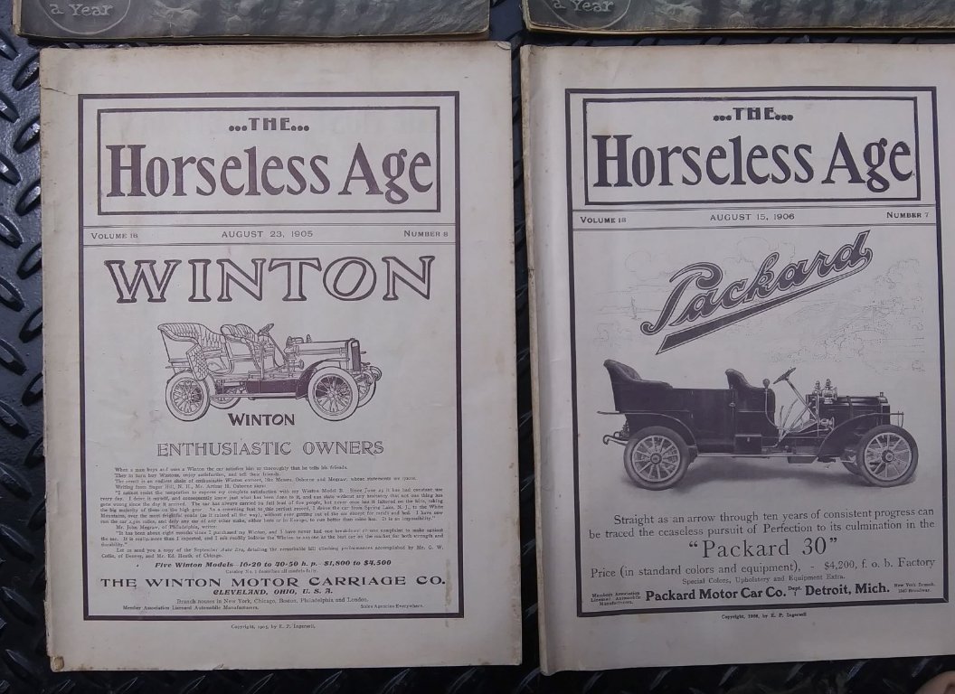 -Two "The Horseless Age" magazines. 9" by 12" and approximately 50 pages each. They are dated August 15, 1906 and August 23,1905. Great advertisements, transportation, car companies, etc. Published in