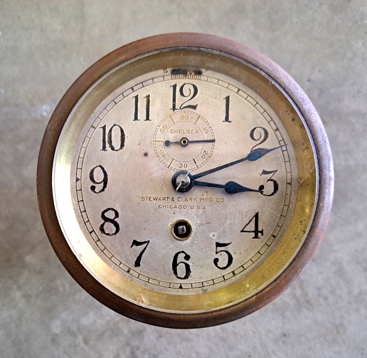 Early large bezel Stewart and Clark brass clock with front key access. Missing key. Square shank. Easy to make a replacement. Also include is a cast firewall mounting bracket. Price is $325 with free domestic shipping. Mark Chaffin (951) 805-0928 SOLD