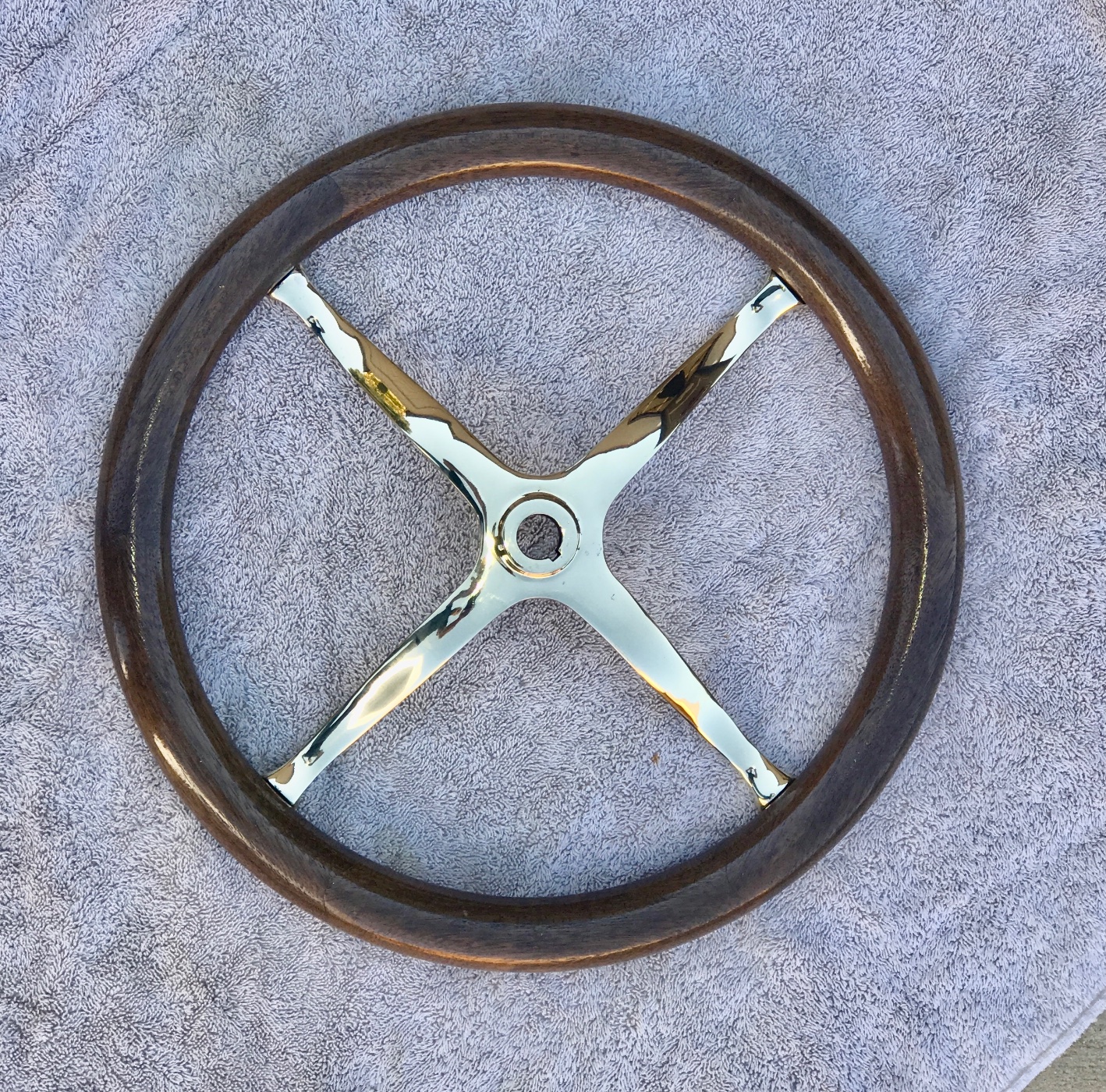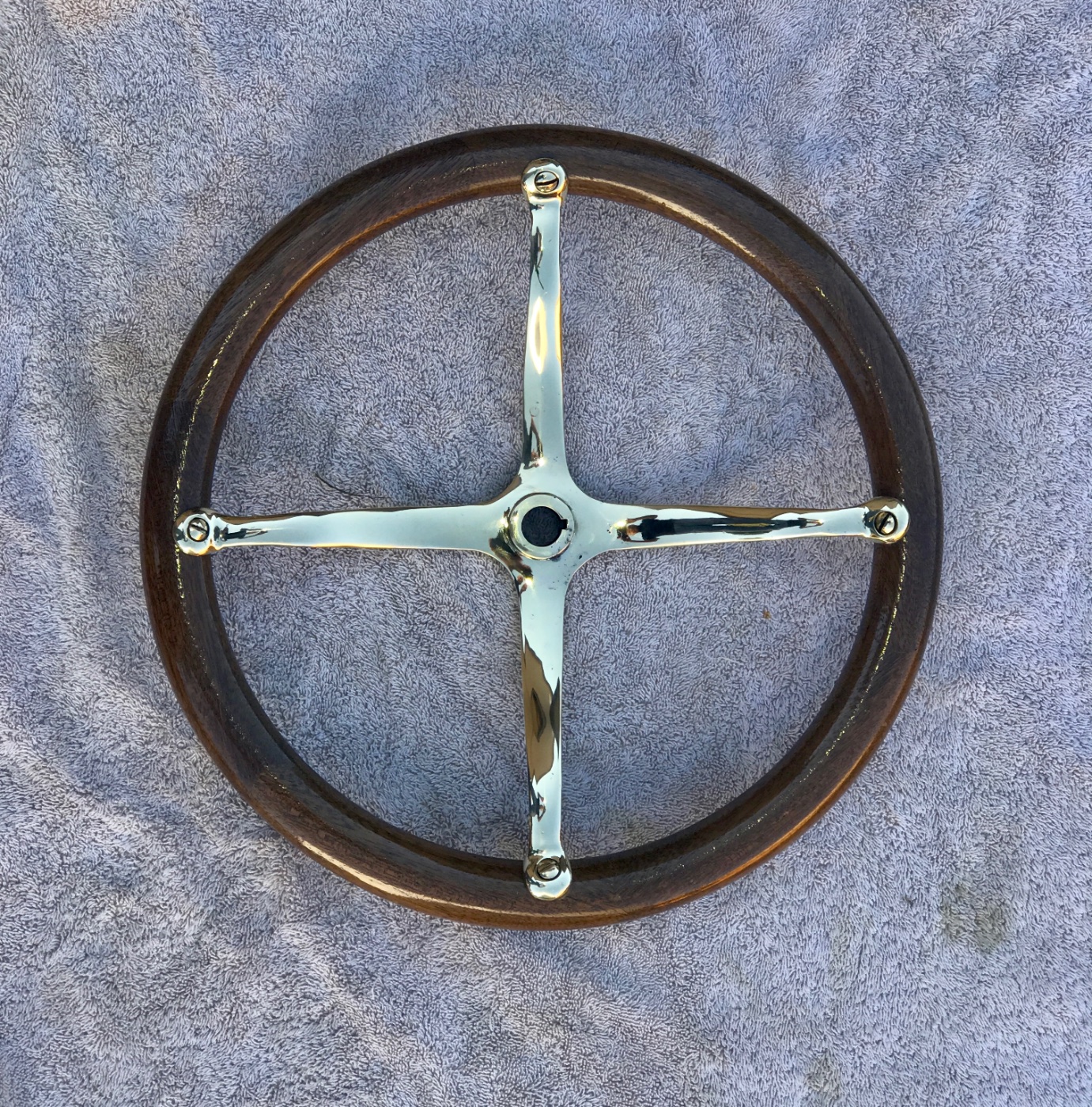 Cast polished brass steering wheel. 15 inches diameter. Nice condition and polish. Has some minor pitting and blems on the bottom side, top near perfect. Wood is very nice no damage or separation. Ready to mount and use. These are not being reproduced anymore. 425 includes shipping US.