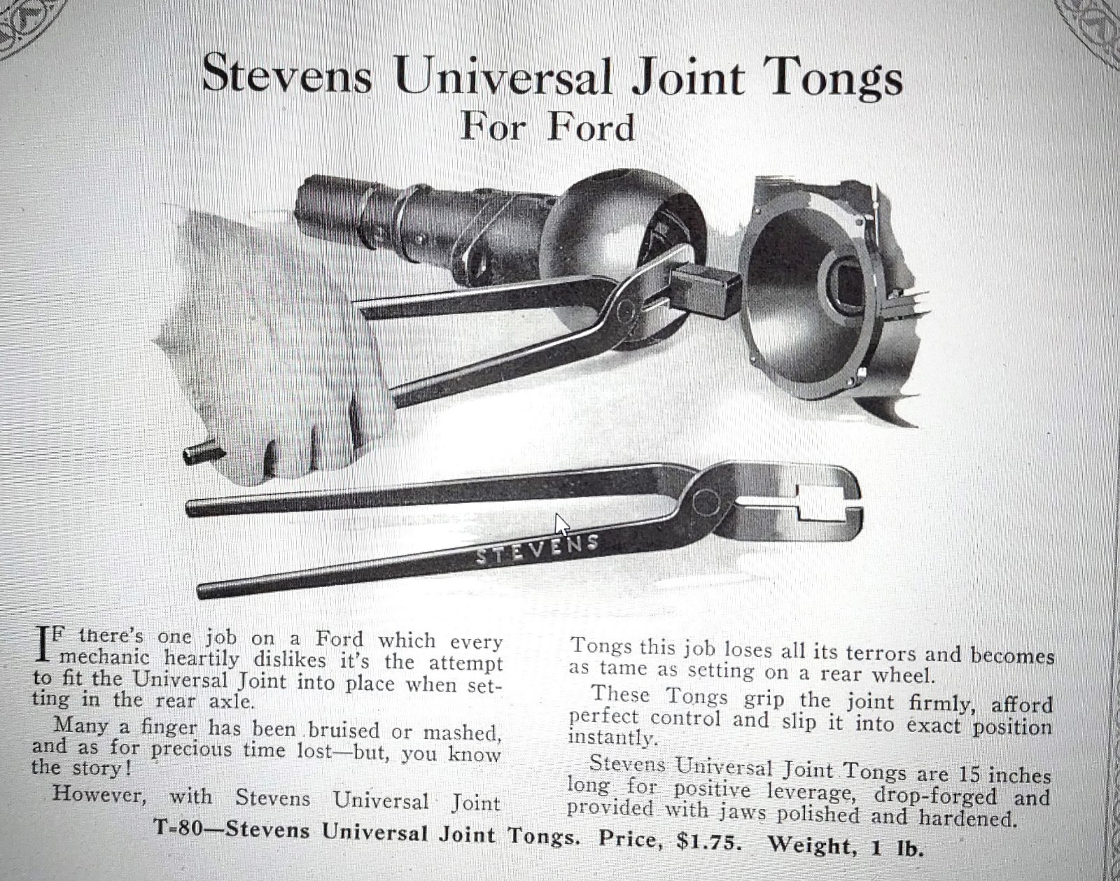 For Sale: Stevens T-80 universal joint tongs. Essential tool to align and inset the u joint into the transmission. Don't try to install an engine or a rear end without one, a real time saver, curse saver, and finger saver. $175 plus postage.