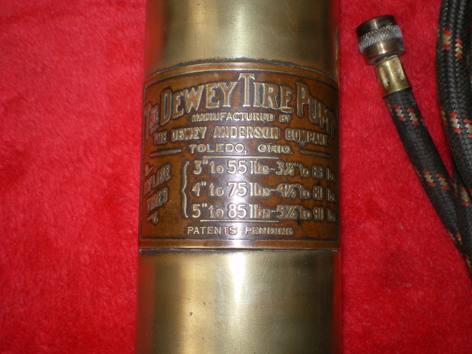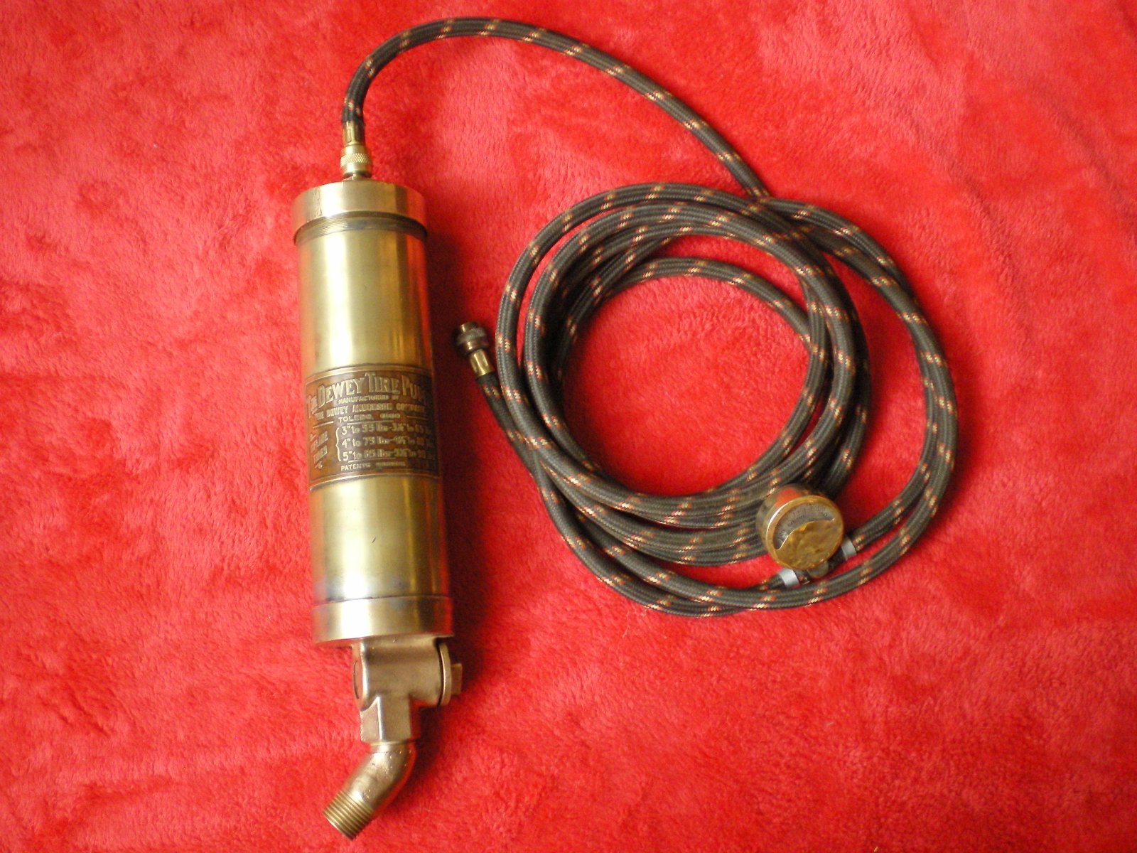 For sale Dewey air pump. Pump has pipe thread to screw into spark plug hole, uses engine compression for pressure. Pump has about 12 feet of hose with 0-150 pressure gauge. Gauge has "patent Sept 12, 1911" on it. Gauge has a few dings on it. Pump is untested. Price $250 plus shipping. Call or text (248) 894-75fiveone. Thanks, Walt