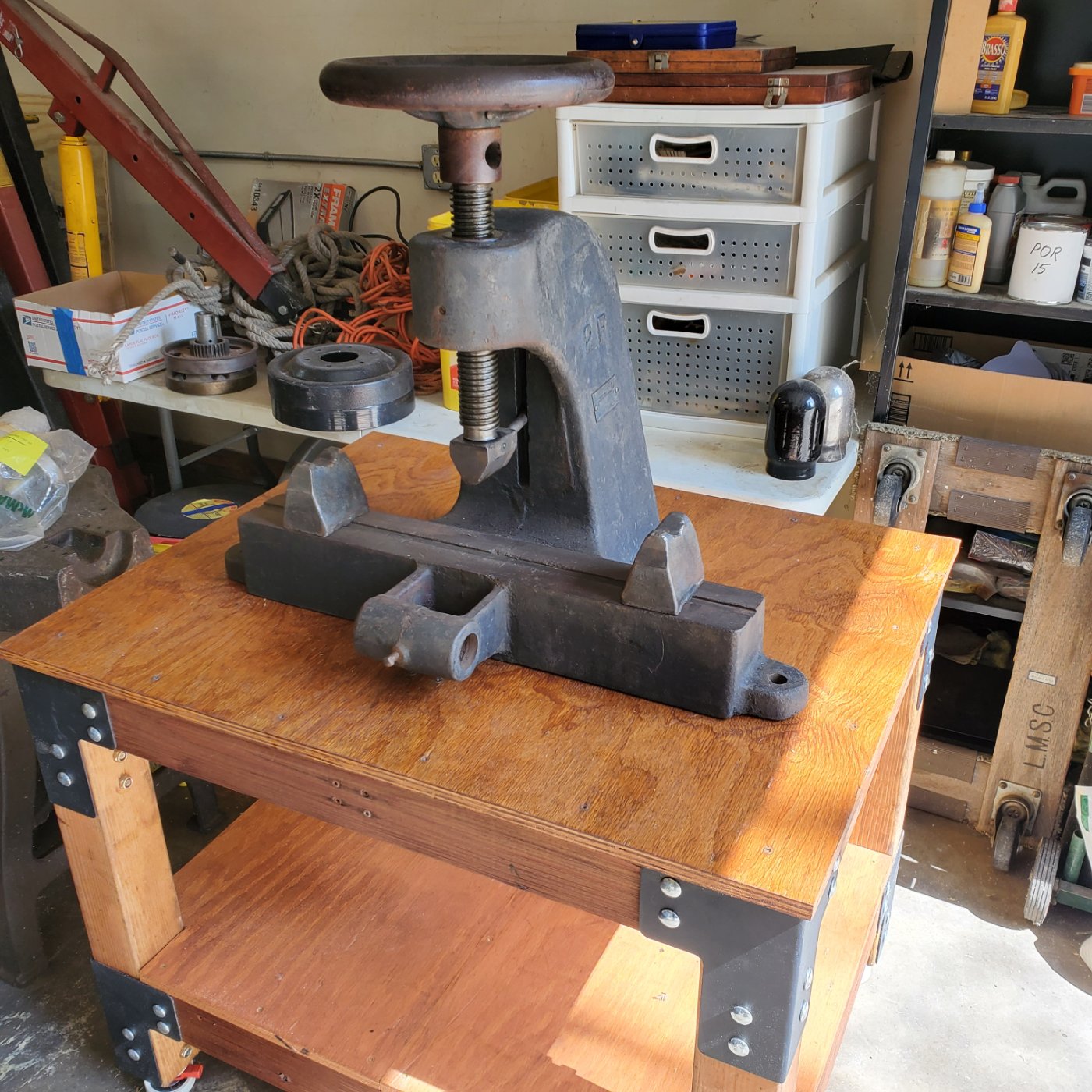 Cleaned and mounted the Fairbanks screw press I recently purchased on a bench I made for it. I need help making the fixtures that hold the centers if anyone has photos, dimensions etc.