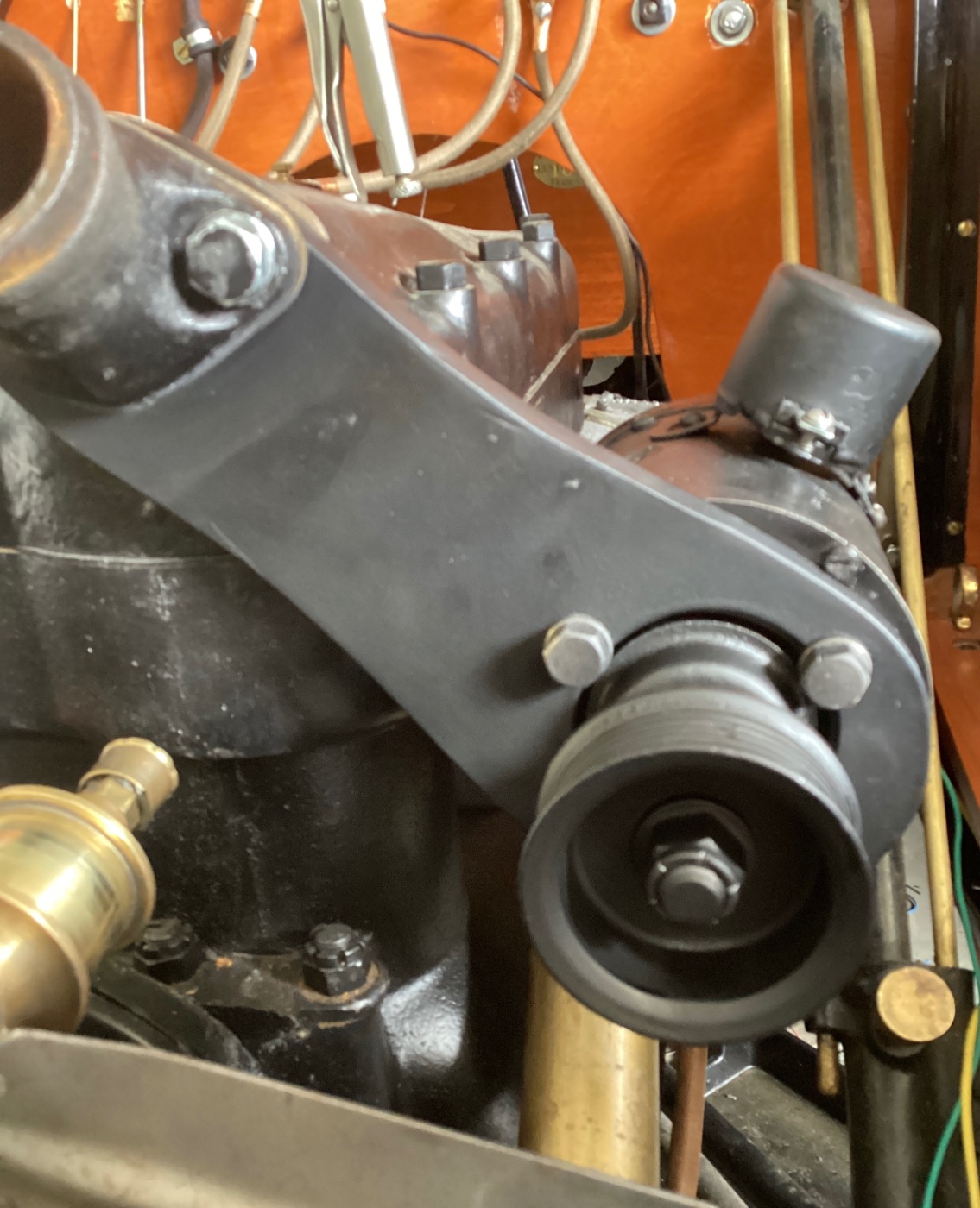 Installed a somewhat period correct model T generator on my 12. Made the bracket and a friend machined an extension to the armature so the fan belt will line up. First bracket I made was too high, thinking if I wanted to have a water pump but made the second one to place the generator lower next to the motor and not sticking up. A modern alternator just did not look good next to all the original 12 motor and everything and that is why I decided on a generator. I will go just so far to be original but in this case there is nothing closer to original 1912 factory equipment. Installing brake lights and blinkers at the same time, a lot of wires.
