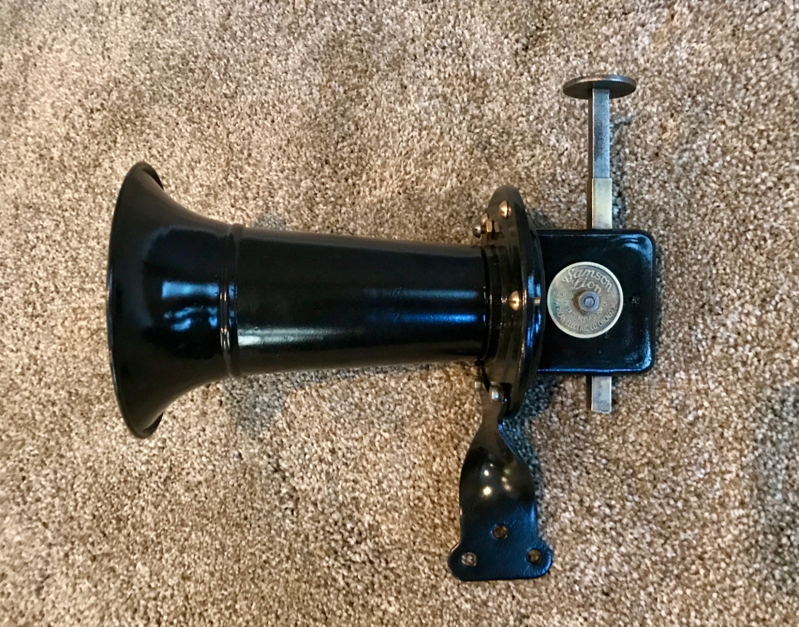 Original Samson Lion mechanical hand horn. Excellent condition, nice paint. No damage. Works great, very loud. Push down plunger to operate. Ready to mount and use. 225 includes shipping.