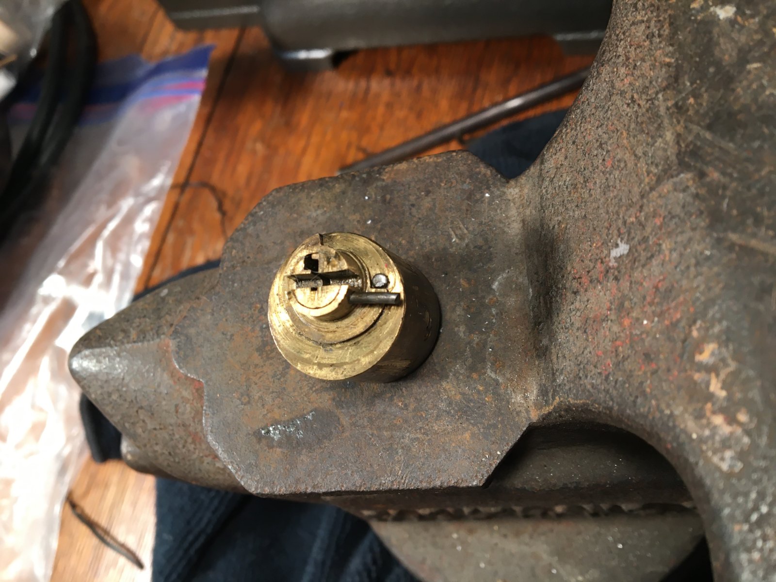 This one has no key, so I picked it, but I can't figure out how the cylinder comes out to rekey it. It's a Corbin keyway. Searches show it looks like their old cabinet type. (Ilco1000G)?). Has anyone dealt with this?