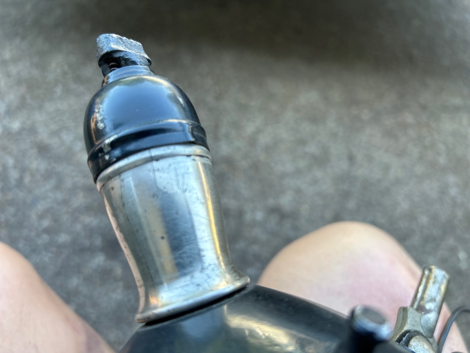 This is in really nice shape. I don’t know if it’s the original paint but it is in decent shape. The trim Ring, glass and reflector are in very nice shape. The wires have been replaced. This is untested but the switch pulls on and pushes off as it should. The Bakelite knob on the back has some minor deterioration and the handle trim has some small cracks.