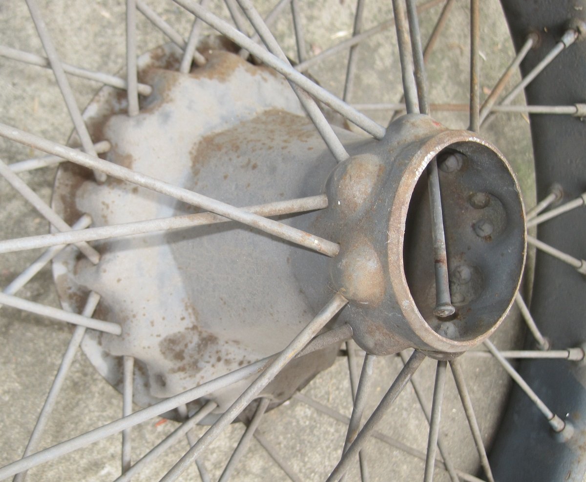 FS one BUDD wire wheel as used on Overlands ca. 1920. You sometimes see these adapted to Model T Fords. Selling just the wheel, no hub. The OD of the wheel is 24" at the very edges and 23" where the inside diameter of the tire meets the rim. Usable condition, there are a couple of bad spokes. Asking $115, shipping not included.