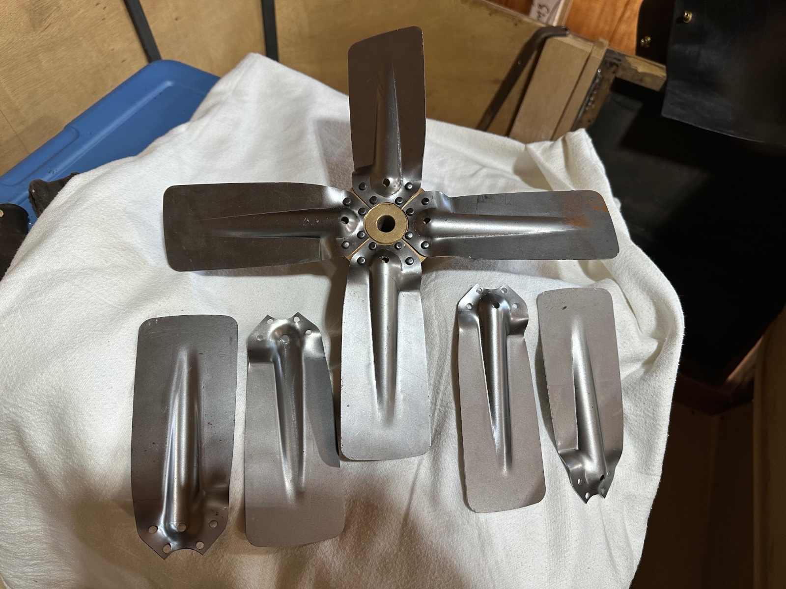 Exact 09-11 fan blades, die stamped w/ mounting holes. $140 for set of 4 , postage $11 US . 09-11 blades have greater pitch and deeper stamping. Langs will rivet the blades on your hub for $30. Have 7 sets left…. Larry Debaugh 4103361728