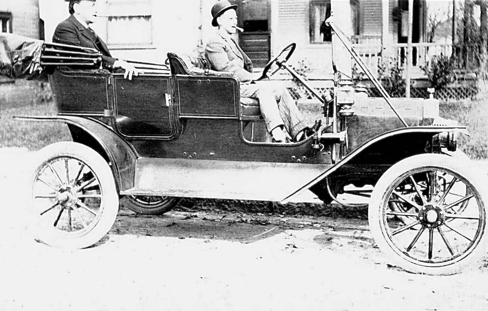 #10 - I’d love to know the story behind this photo. New-looking 1913 with electric lamp conversion (for the side lamps too, maybe ?). That tent is going to be there for the season, with a wooden floor. The two gents look pretty comfortable, and the saddle horse has a real solid ground tie !