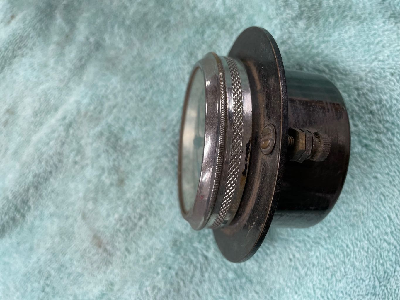 Phinney-Walker brass clock 2 3/4" OD that is the matching accessory to Stewart models 11 and 26 speedometer heads, see the 3 threaded holes in the back. This particular clock was factory modified with a rim added for panel mounting, the ring can be easily removed for bracket mounting as used on Model Ts 1911-1914. A very nice clock that will require a trip to the clock shop as it has been overwound. It may be New Old Stock as it shows no wear and no signs of ever being mounted. $125 which includes 48 state domestic shipping.