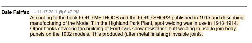 Absolutely Ford used spot welding. The body of my 21 Touring was joined together at the lower section at the rear doors using three spot welds. And by the way the spot welds were pretty good. You could barely see them when Ford painted the bodies.