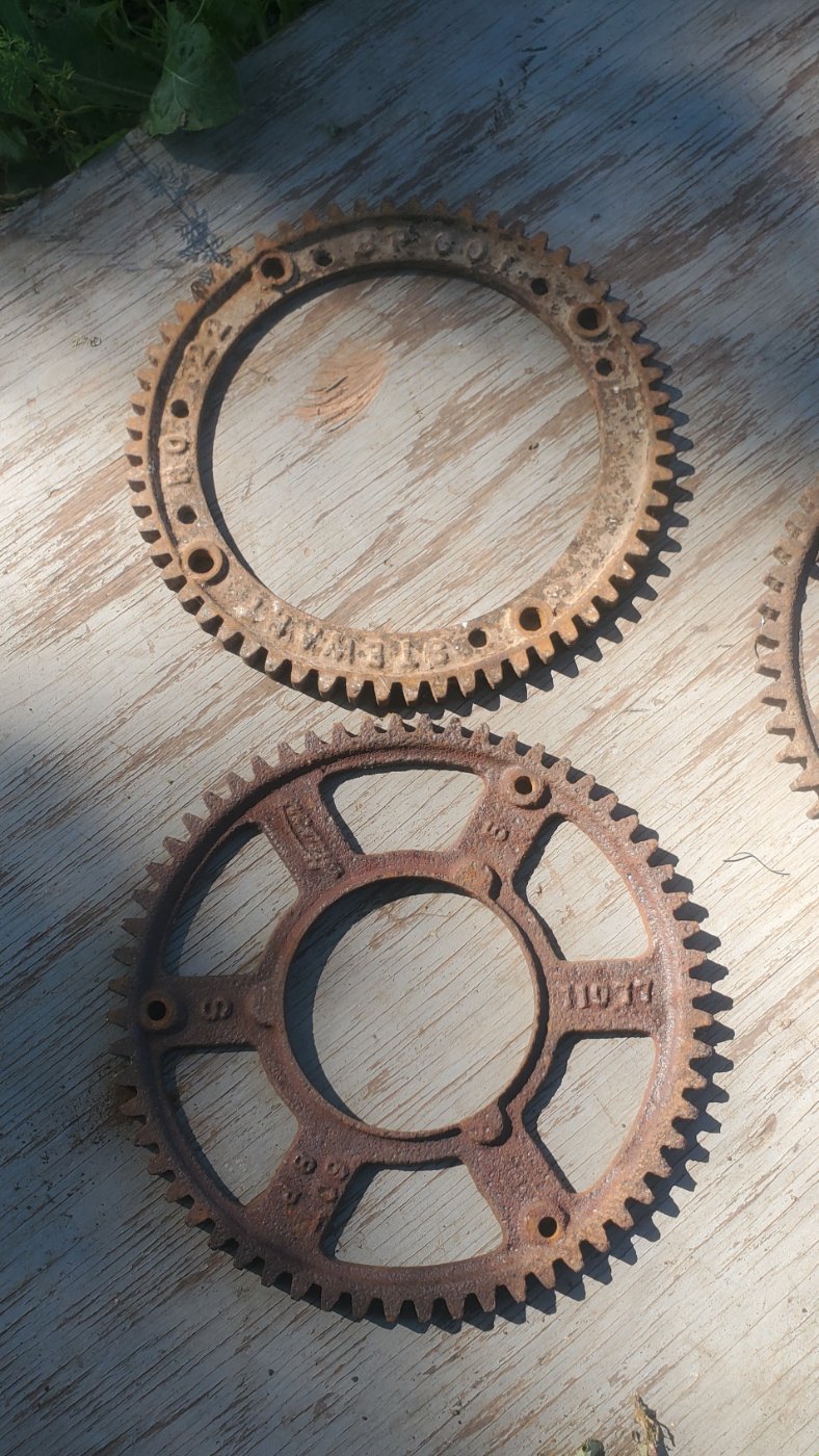 Interesting gear with no spokes Karl. The block printing is early, as is the four hole mounting drilled into the bosses on the casting. Then it has also been drilled for a second four hole mounting. Using the lower right of these holes, two more have been drilled to make a three hole mounting like the later gears.