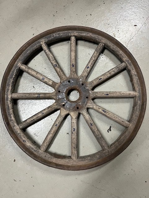 If the original wood is in very good condition? The wheel can be reworked and reassembled. Again, the finished wheel MUST be very tight in all places, rim to felloe, felloe to each and every spoke, and spoke to hub. If the wood has shrunk some from age (very common!), steel shims can be used in any connecting points.