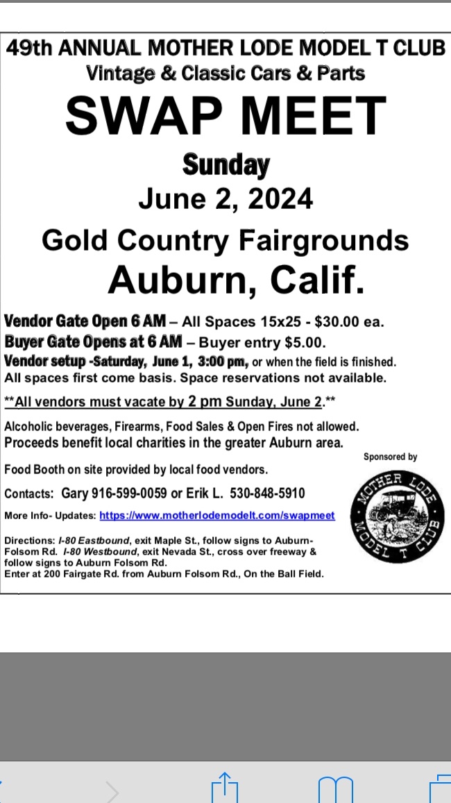 Re: 47th ANNUAL MOTHERLODE MODEL T SWAP MEET JUNE 5 2022 AUBURN CALIFORNIA