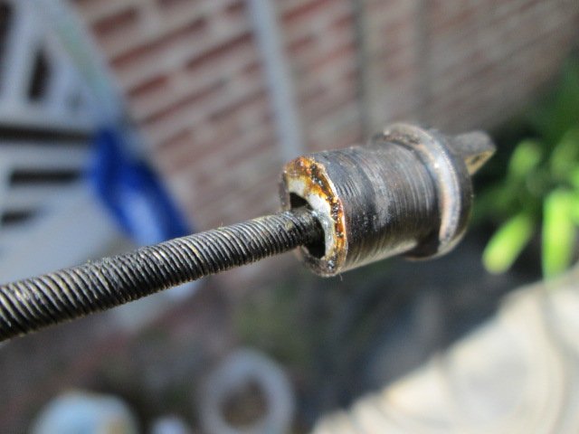 I would fill the hole with solder, unless it is now just out of site below the rim. It's full of solder. The black is just some carbon powder around the cable. I pulled on it, and it seems tight. I now must figure how to install the other connector so the length is correct for the cable housing. It...