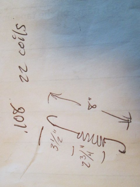 My spring measures 8" long total, made of two straight pieces with round bends at each end. The coiled part (22 coils) is 2.75". The spring steel is .108"D. The top part (straight with a hook) is 3.5" long. The hooks are face opposite directions. Attached is a sketch.