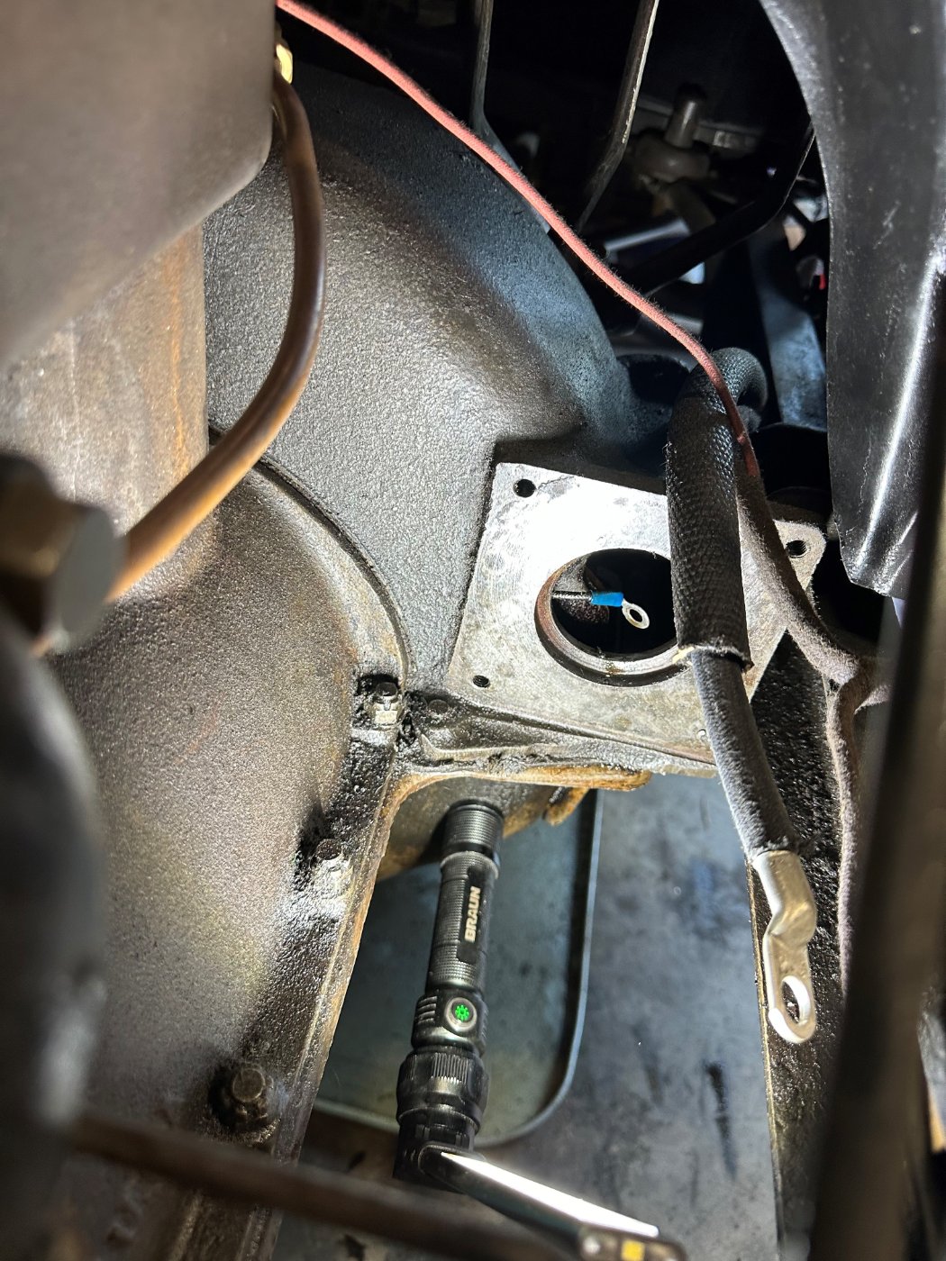 I pulled off my starter this evening and SURPRISE, this wire said hello to me. Any idea what it is? I will be taking the hogs head off tomorrow to get a better look. The other surprise was the broken bolt (bottom right). Got it out pretty easy though.