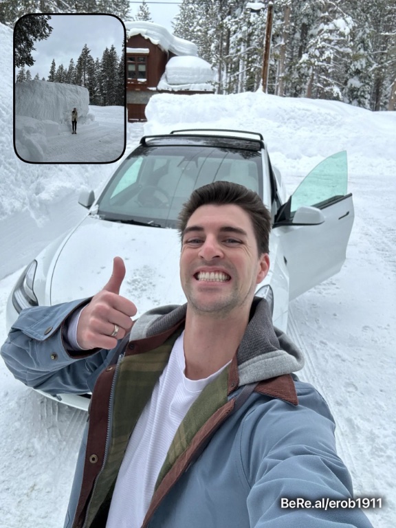 My Grandson, his wife and his 4 WD 1300 HP (T)esla. At our cabin at Tahoe/Donner. That's Truckee, California. This picture was tken on March 20, 2023.