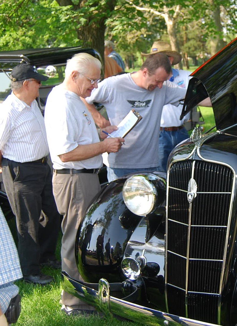 Wally and Dave judging cars at the Midwest Chapter's annual restoration contest.