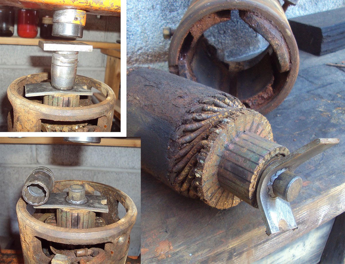 At this point the armature was showing some movement and did come out of it's shell. My next task is to remove the punctured plate from the shaft. The parts may clean up and work. Or not.