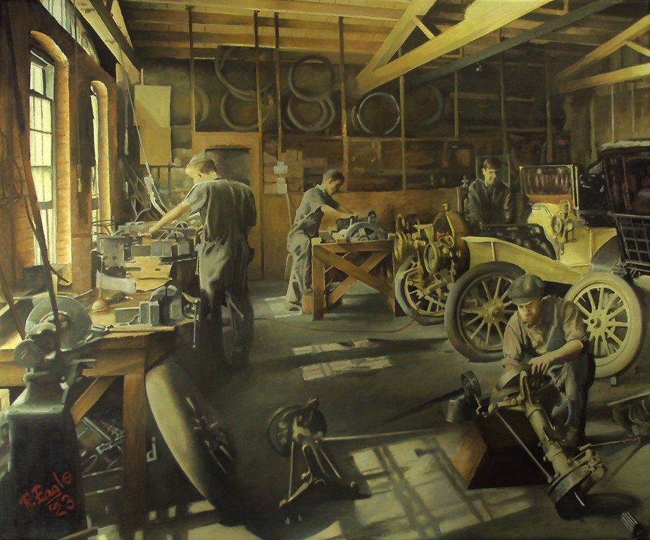What a great painting...I feel like I'm standing in the doorway watching the guys work on the cars!