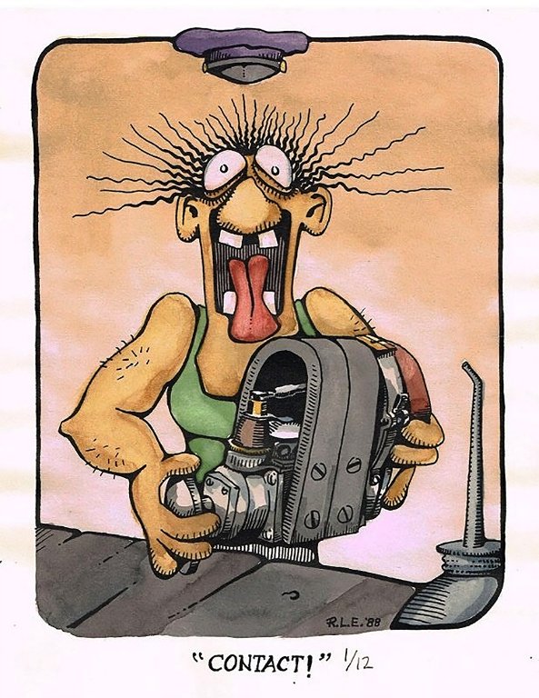 Rich,You had posted a painting of a fellow holding what appears to be a near match to my American Bosch magneto I got for my Republic , and his hair is standing up and it says "contact" .I mentioned to some folks on smok stak that I had grabbed mine in just the wrong way when I first unboxed it and it got me good! I was going to ask if I could post that on that forum thread for those folks to see as it is all but real life what happened to me last week.