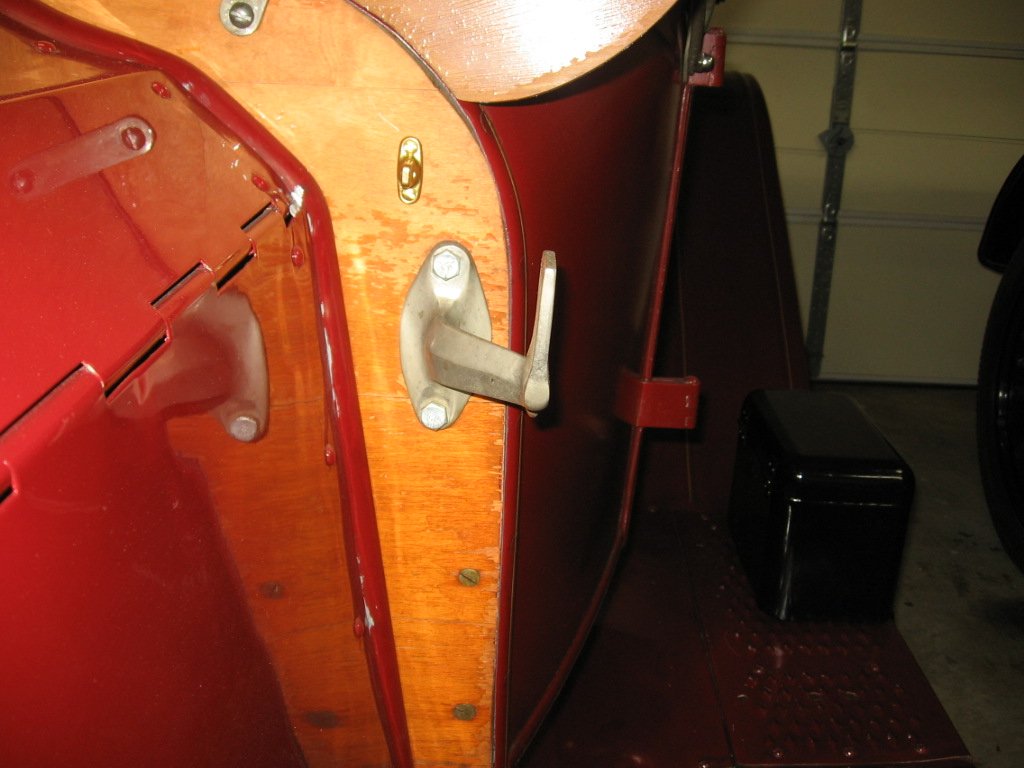 One other difference - all of the pictures of Flanders cars that I have seen have straight support rods that go up to the windshield pivots. However, my windshield support rods have a stylish curve at the bottom. The curve has to face the direction shown. If I turn it the other way, it interferes with the opening of the door. Maybe a late 1912 change? :)