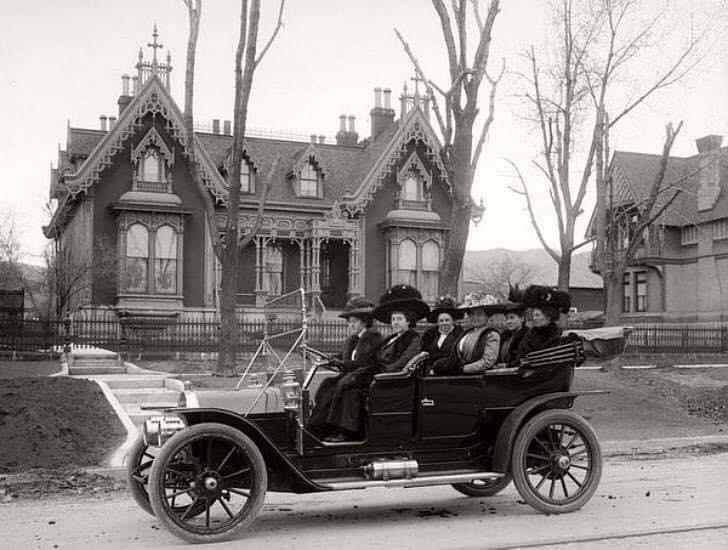 Photo dated 1909. With hats like that, those ladies had no need to raise the top. What a beautiful home in the background.