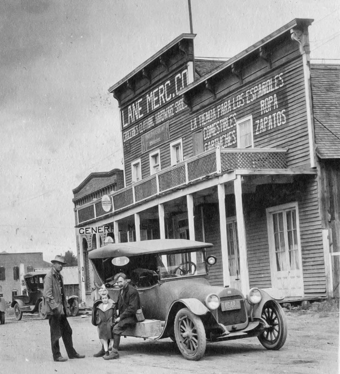 Photo caption is "Ketchum, Idaho - 1920". Many years before Hemingway discovered it, and 16 years before Harrimans built "Sun Valley". After the mines played out, Ketchum might have just blown away in the wind if it hadn't been for . . . Sheep !! Sign in Spanish on the mercantile tells of a significant trade with Basque sheepherders !