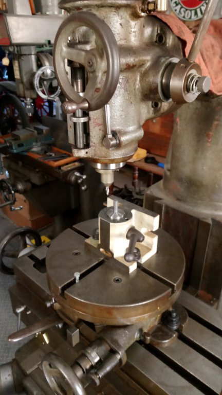 That last job had me sweating over possibly breaking the drill, so I made a custom finger-feed sensitive drill setup which works very well. Fit of arbor to socket is 100 millionths and is smooth as butter.