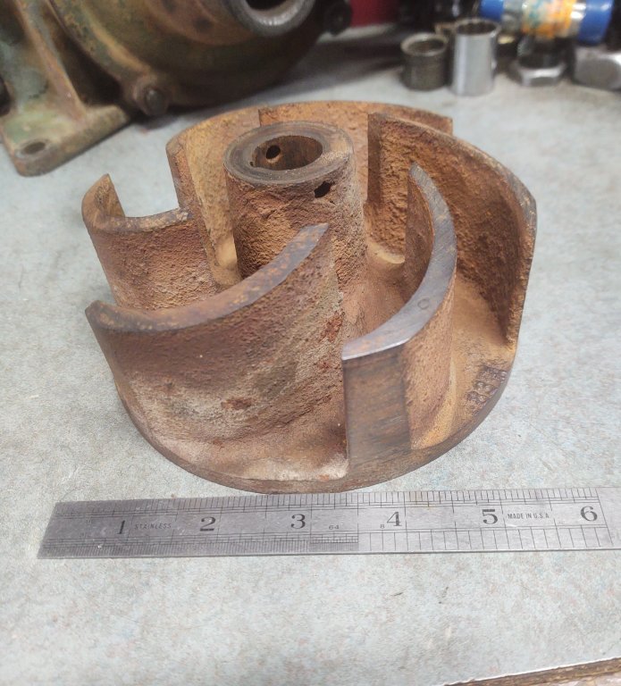 Impeller. 5-1/2 diameter and right around 2-3/4 tall in this view. Cast iron. runs on a 3/4 shaft.