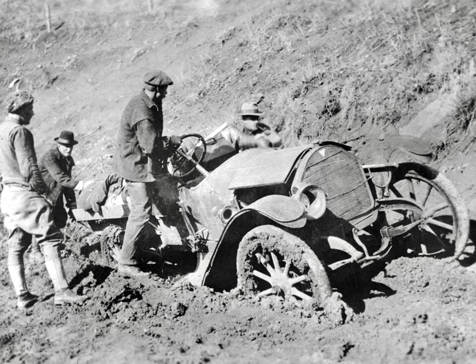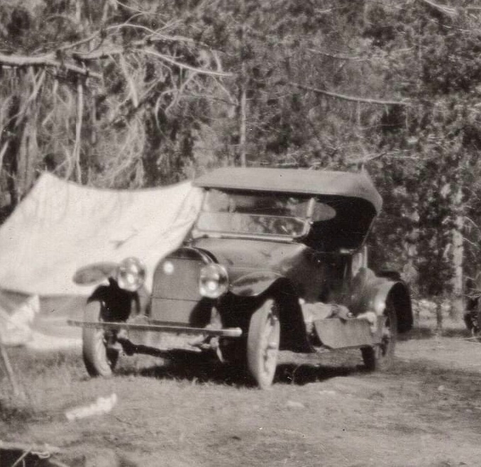 This photo has me pondering what motivated "motor boys" to build speedsters in those early days as opposed to how modern day builders of speedsters approach the problem. This photo shows a vehicle stripped down to essentials for a mostly roadless cross-country trek over wagon roads and cattle trails. It's packing gear for roughing it, and making spot repairs.