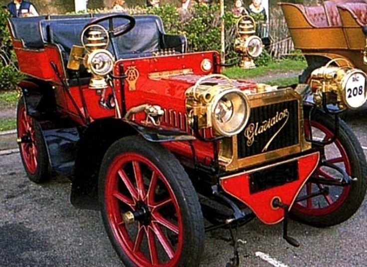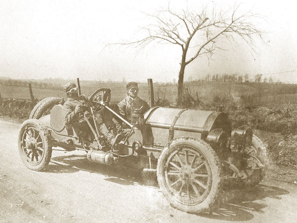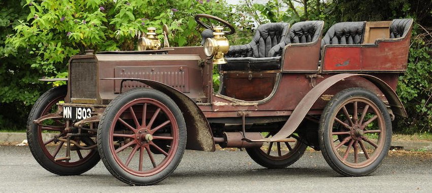 This Gladiator 10 HP, voiture routière de 1903 is the closest I have seen. This "Believed 1903 Lacoste et Battmann 12HP twin cylinder Rear-Entrance Tonneau" also has some similarities to it. Maybe a different year or model. I was looking for Clement Bayards as they seem to ring a bell. The attire and the headlamps didn't look like U.S. items to me.
