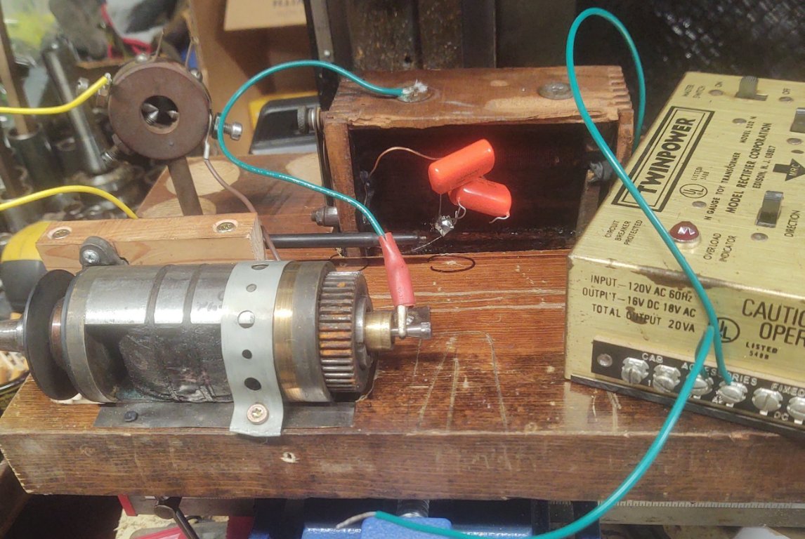 Bed frame tester-1. The bare green wire dangling below the base is touched to the armature frame, the gear (the nut is loose), the plumbers tape or the plated brass in the cradle to wake up the armature.