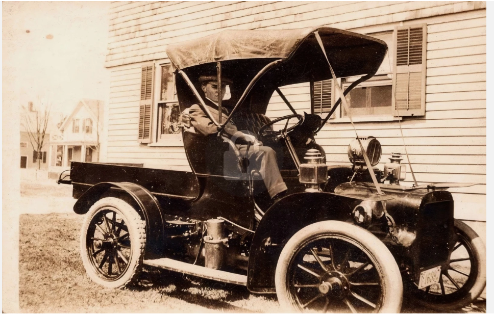 I believe an about 1906/'07 Cadillac runabout with a pickup box added onto the rear. That round thing above the hood is an acetylene gas (large) spot lamp. An after-market accessory that some people in the early days would choose over two headlamps for night driving. More common on automobiles and trucks before 1910, however, they remained available through the 1910s and were often used on fire trucks even much later. Some Mercer Raceabouts (and similar cars) had them in the mid 1910s, and a few have been restored that way.