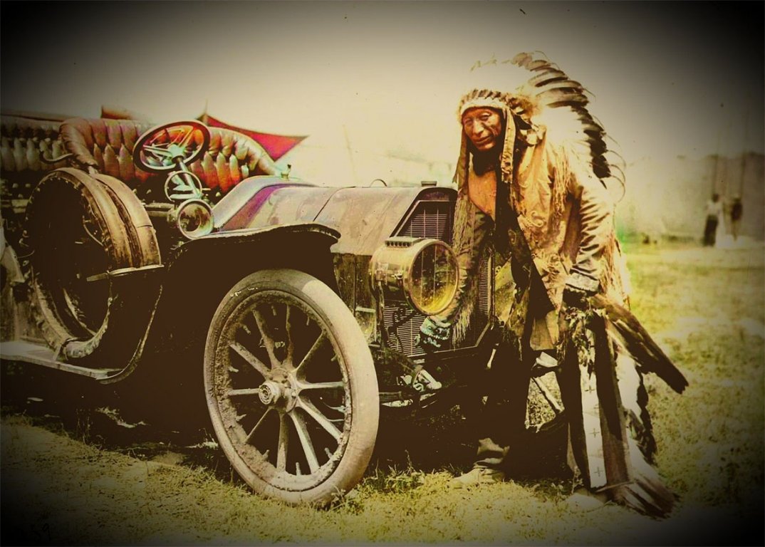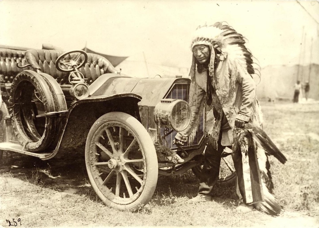 Chief Iron Tail was a regular in the Buffalo Bill wild west show. He is cranking a 1915 Locomobile. Often called Geronimo's Cadillac. He was the most photographed indian chief in the 19th & 20th century. It is his profile that was used for the indian head nickle from 1913 to 1938. He was an Oglala Lakota Chief.