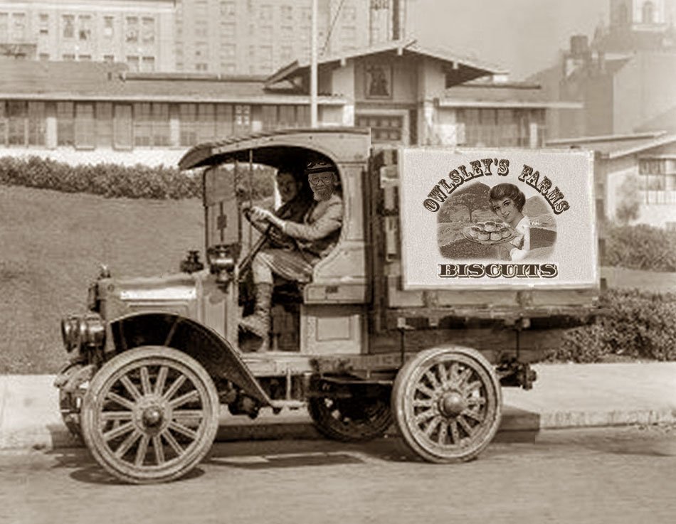Rich, thank you for providing the photo of KD behind the wheel of the Owlsley’s light delivery truck. Historically important for two reasons, the sign imprint on the van shows Ma Owlsley in her younger days, and the truck proves that scale receipts found in Seamus’ documents were indeed for truck loads in excess of five tons net. It also goes along with another of Ma’s folksy sayings, “Light biscuits are for sissies.”