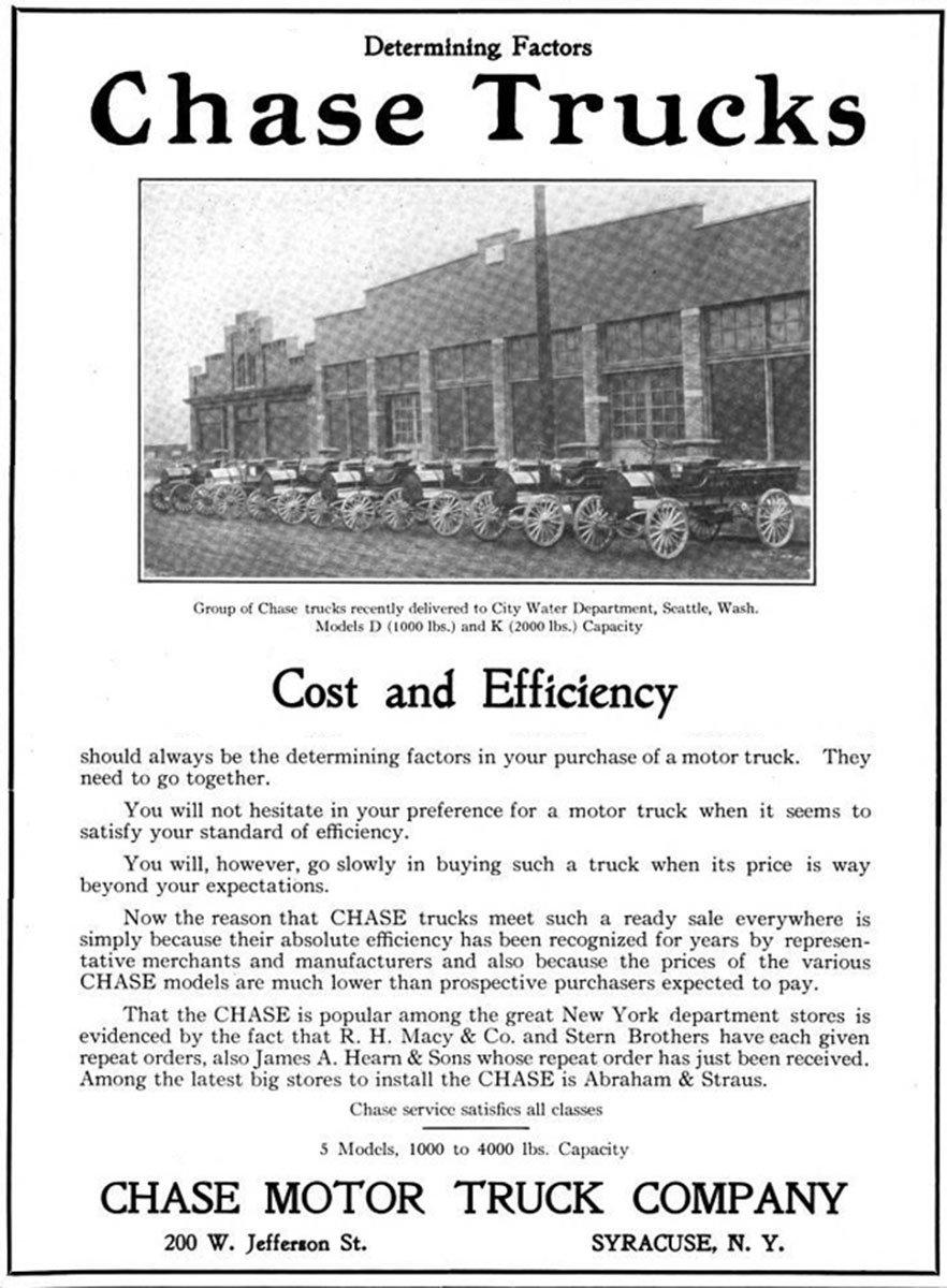 I believe I have stumbled on to what that truck is. Chase Motor Truck Company (1907-1919) was a manufacturer of trucks in Syracuse, New York. The vehicles were known for their air-cooled two cycle engines. While these could be other models I believe the platform rear springs, the steering configuration and the hood with belt are all features of the car Herb has presented. Also the frame rails seems to be a wooden slab. A shroud under the engine for directing air looks the same too.