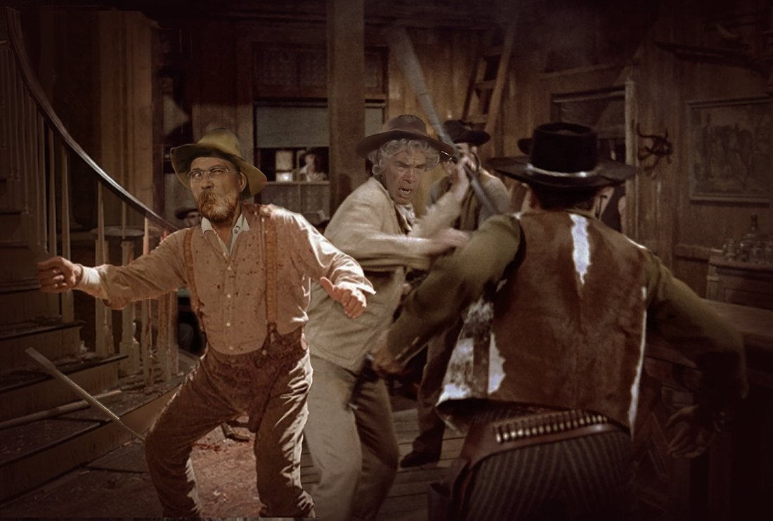 Cuthbert never knew when to keep his mouth shut, but then again, the Biffle Mob were a touchy bunch, and easily offended by almost everything. It was truly fortunate that Grunda was not one of the bats that fell from the ceiling. Kid Shelleen was a formidable ally in a bar fight, and the pair could have easily bested the Biffles even without Ernie's intervention. He never did get the roof fixed. If you're in the saloon sometime when it's raining, be sure not to take the table between the terpsichord and the keg of pickled wombat wings. It's a good thing Calhoun is a dry county.