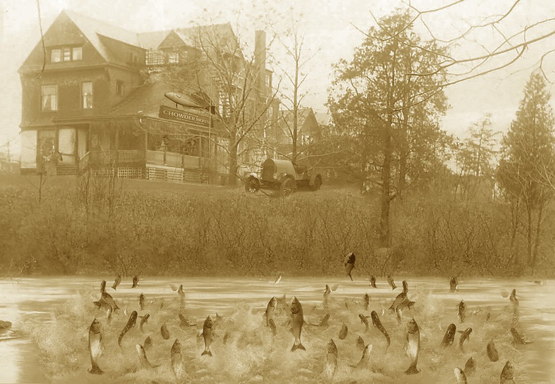 This would have been the year before the last one. Floods were popular in the Basin for a number of years. That's Felton Breathwhit in the foreground operating the intake on his vacuum fishing device (another Kalamity Dick invention). Felton ran a highly profitable fish and chowder house in the home seen in the background. Reduced stream flows in later years left the Sludge Creek drainage a stagnant slough. With the fishery gone, Breathwhit tried a frog-leg and salamander menu, but vacuum fishing was ineffective for taking amphibians. Eventually he turned his hand to moss farming.